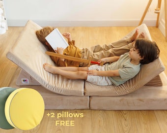 A large thick and sturdy base a thinner seating cushion and two triangular. This comes with 4 pieces. Web Foamnasium Blocksy Kids Couch.
